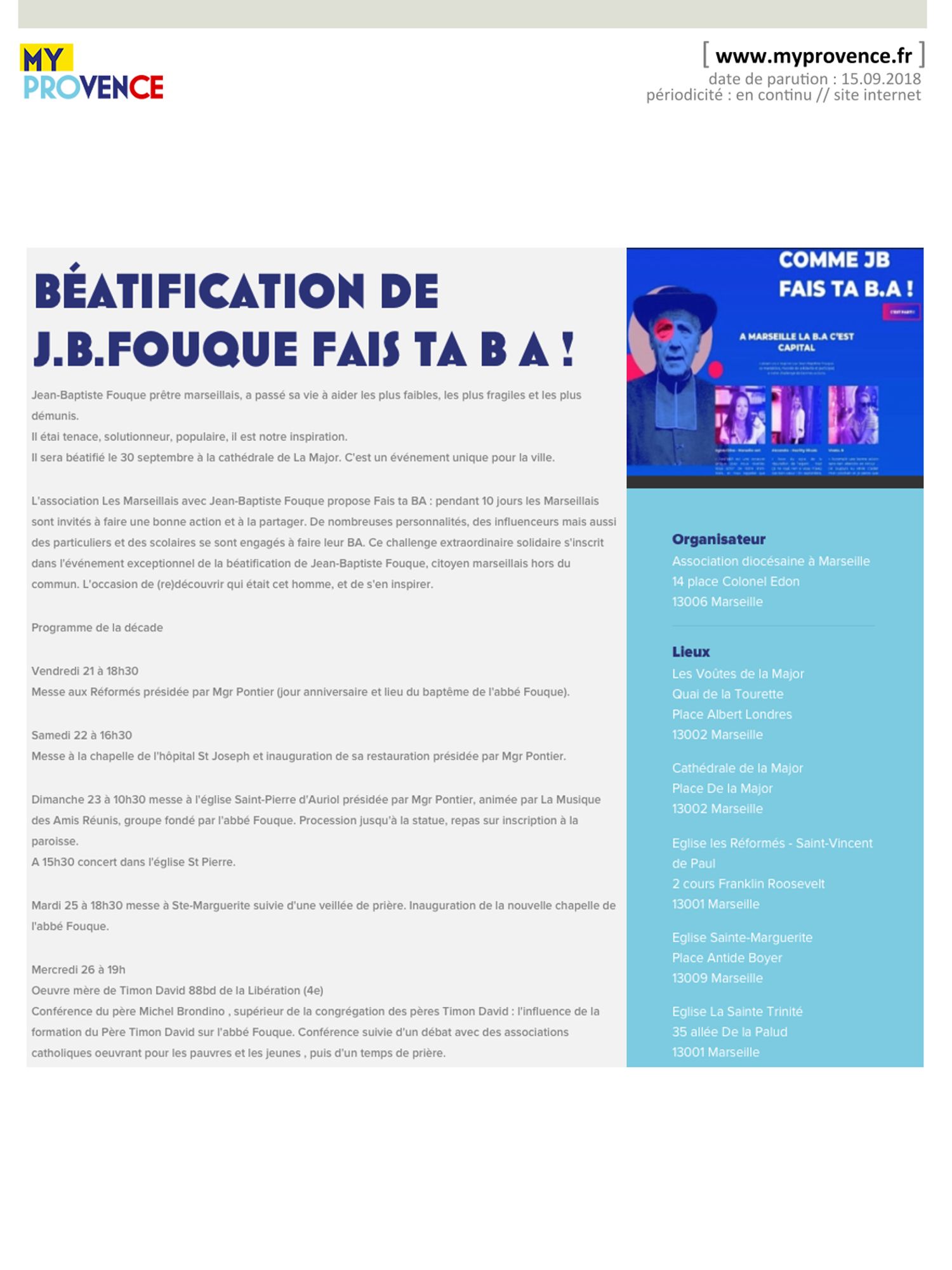 MyProvence.fr, 15/09/2018 : Béatification de J.B Fouque fais ta B.A!