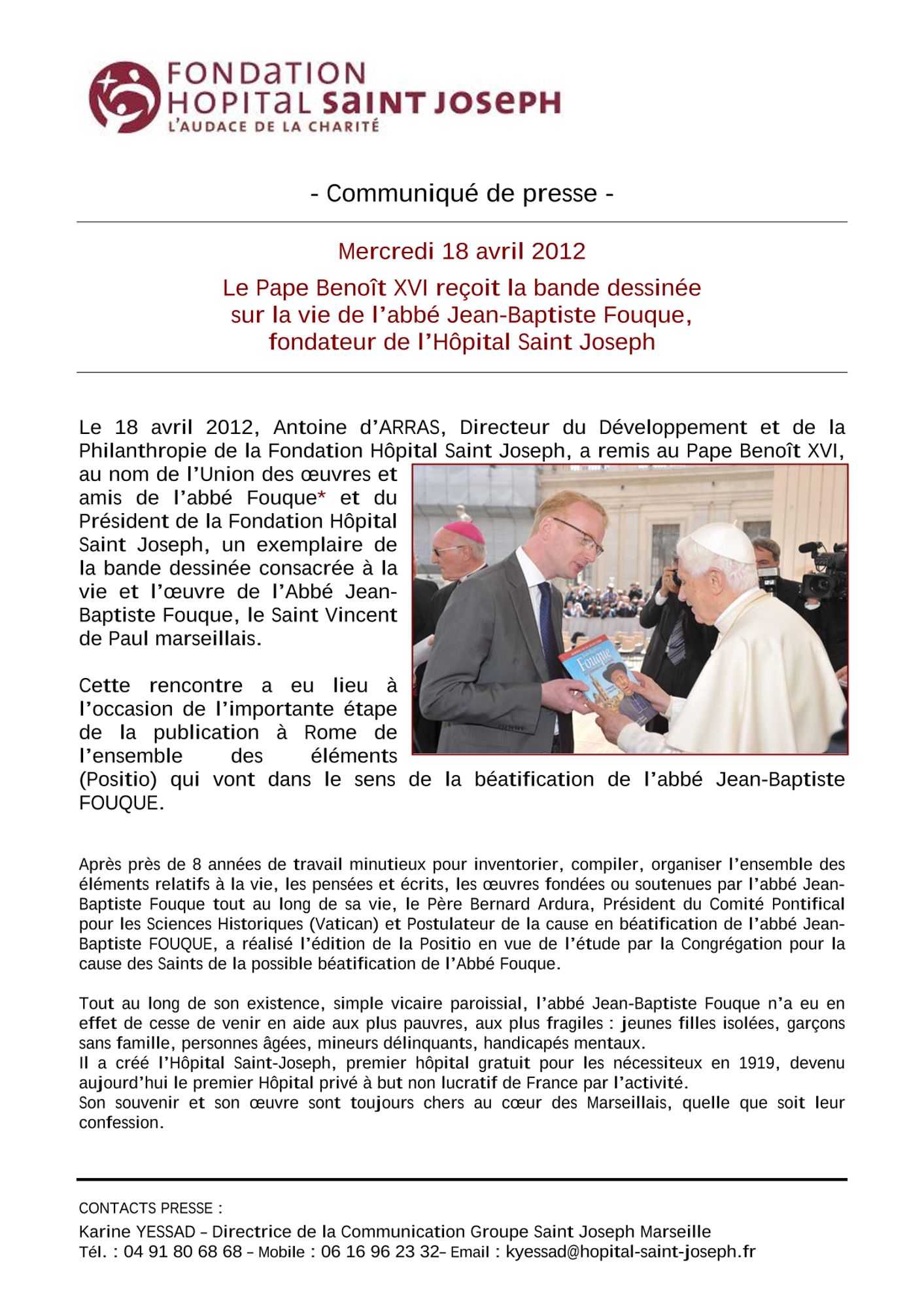 Le 18 avril 2012, Antoine d’ARRAS, Directeur du Développement et de la Philanthropie de la Fondation Hôpital Saint Joseph, a remis au Pape Benoît XVI, au nom de l’Union des œuvres et amis de l’abbé Fouque et du Président de la Fondation Hôpital Saint Joseph, un exemplaire de la bande dessinée consacrée à la vie et l’œuvre de l’Abbé JeanBaptiste Fouque, le Saint Vincent de Paul marseillais.