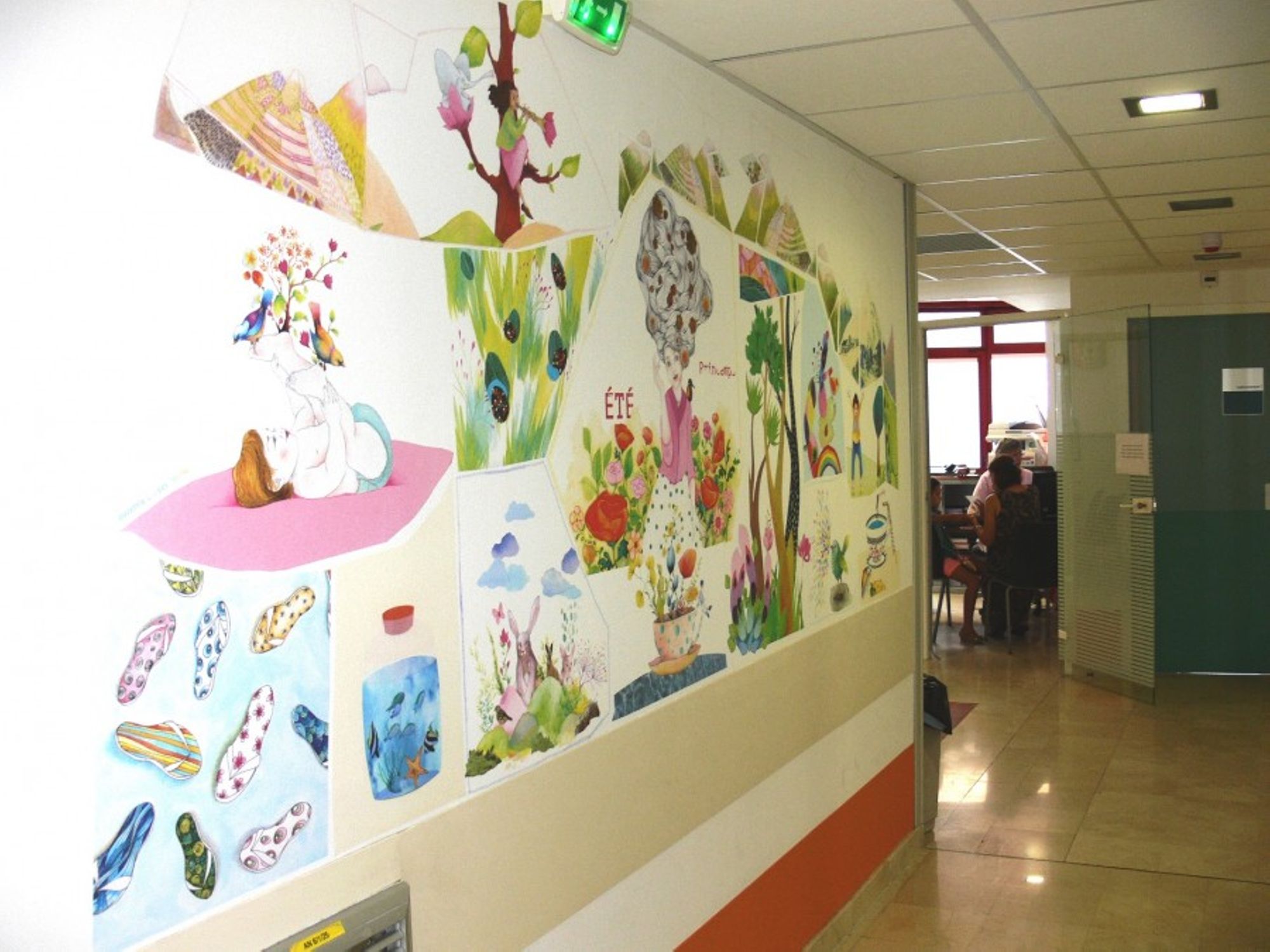 Après la décoration du service des Urgences Pédiatriques du Pôle Parents-Enfants Sainte Monique*, les locaux destinés aux consultations pédiatriques de l’Hôpital Saint Joseph s’animent désormais de jolies fresques oniriques et colorées sur le thème des quatre saisons réalisées par la même artiste, Laurence Cleyet-Merle, graphiste-illustratrice.