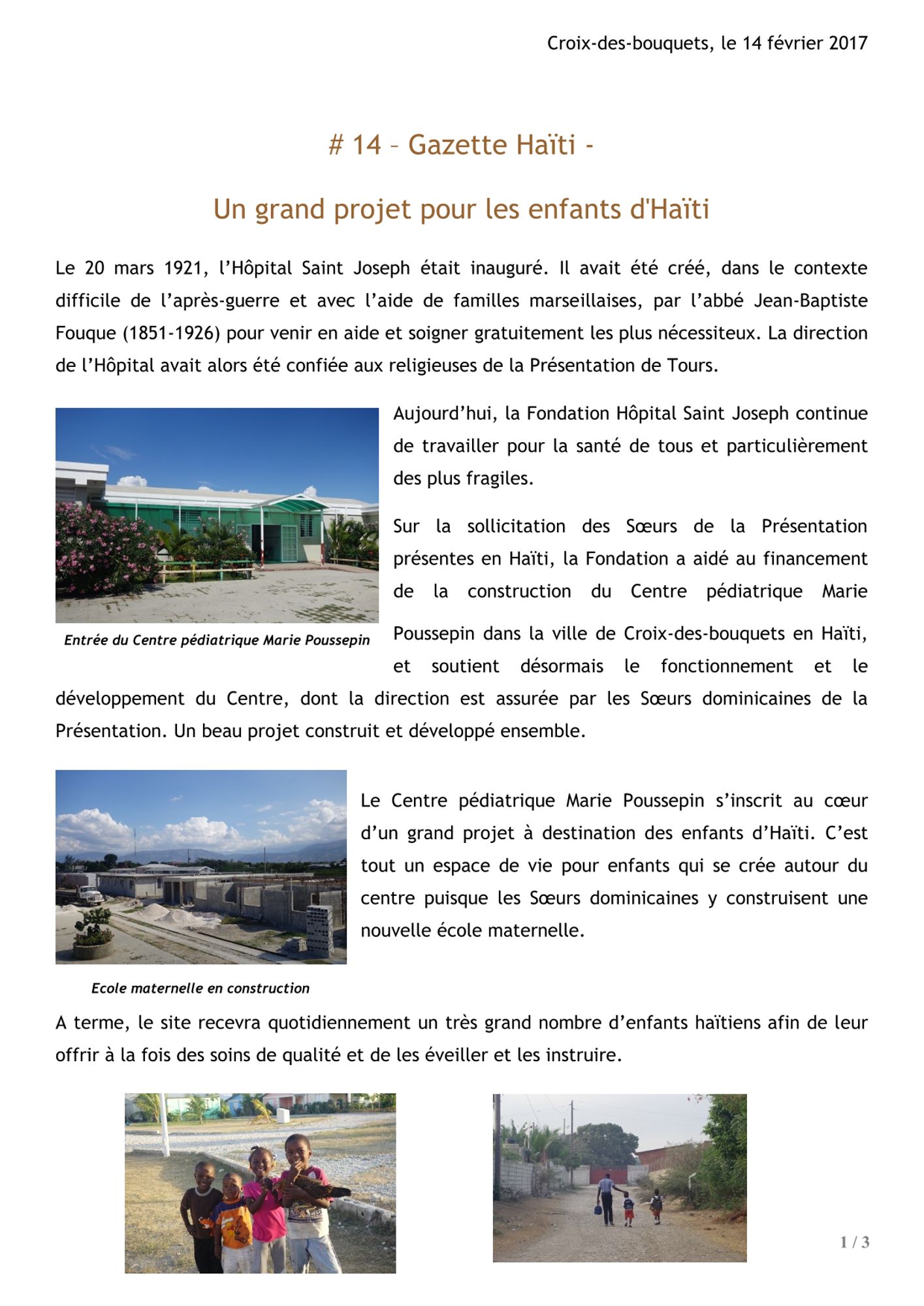 Au travers de cette nouvelle Gazette, découvrez où en est le Centre pédiatrique Marie Poussepin, et ses projets à venir toujours à destination des enfants d'Haïti.