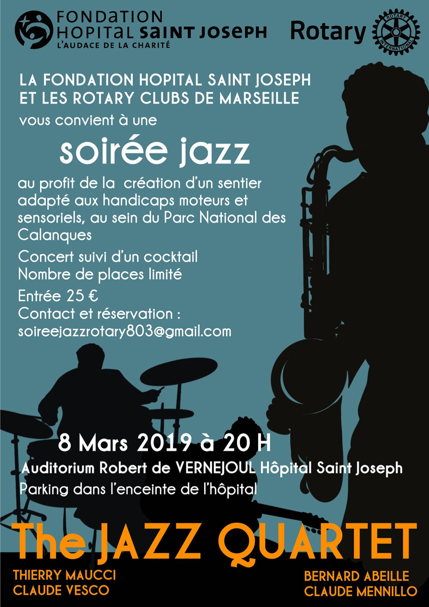 La Fondation Hôpital Saint Joseph s'associe aux Rotarys Clubs de Marseille pour un concert de jazz caritatif avec le quatuor The Jazz Quartet, le vendredi 8 mars 2019 dès 20h00, dans l'auditorium Robert de Vernejoul de l'Hôpital Saint Joseph.