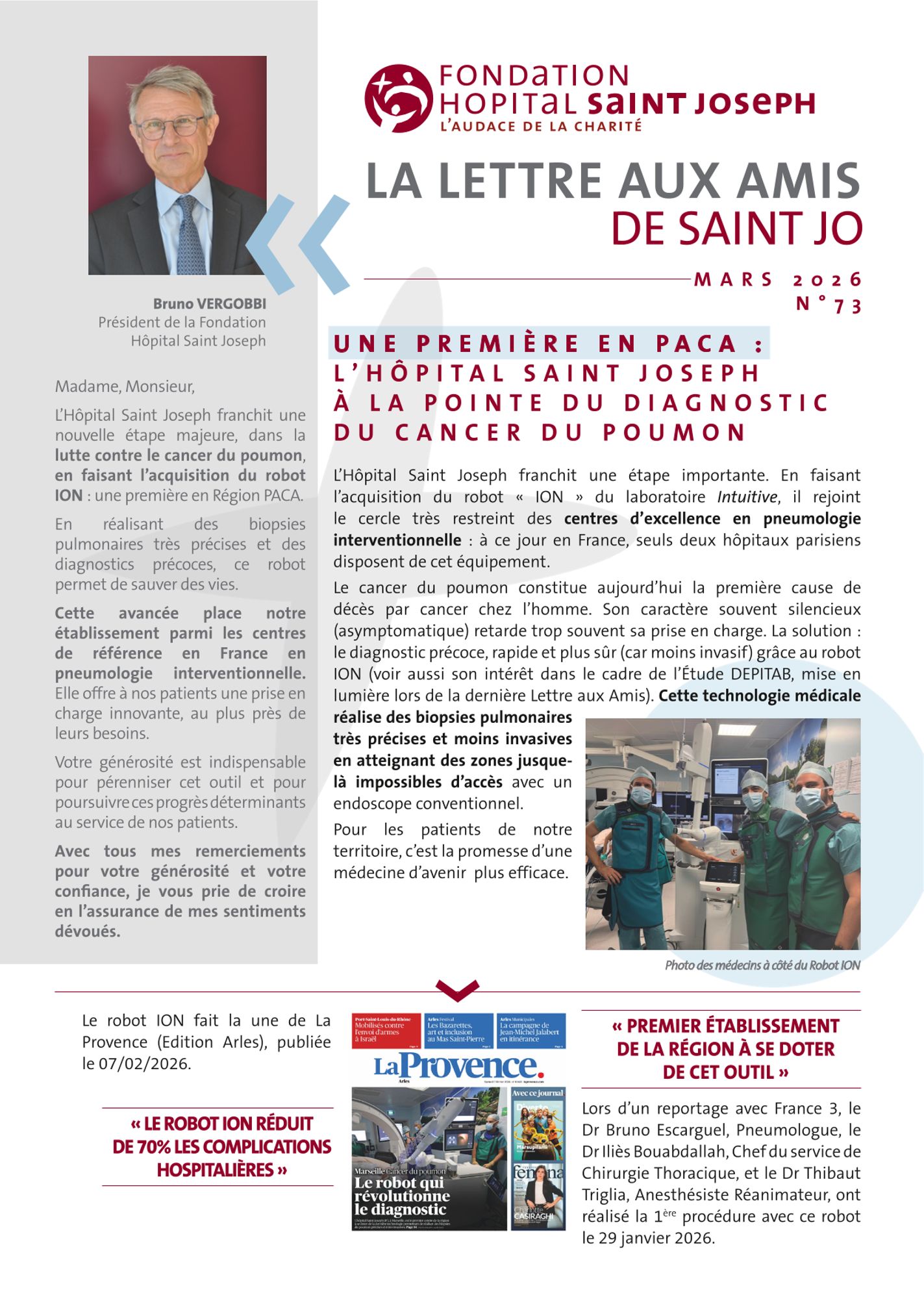 L’Hôpital Saint Joseph franchit une étape majeure en acquérant le robot « ION » d’Intuitive, rejoignant ainsi le cercle très restreint des centres d’excellence en pneumologie interventionnelle en France. Face au cancer du poumon, première cause de mortalité par cancer chez l’homme, cette technologie offre un diagnostic plus précoce, plus sûr et moins invasif grâce à des biopsies d’une précision inédite. Une avancée décisive pour les patients de notre territoire et pour la médecine de demain. Nous vous présentons dans cette nouvelle Lettre aux amis.