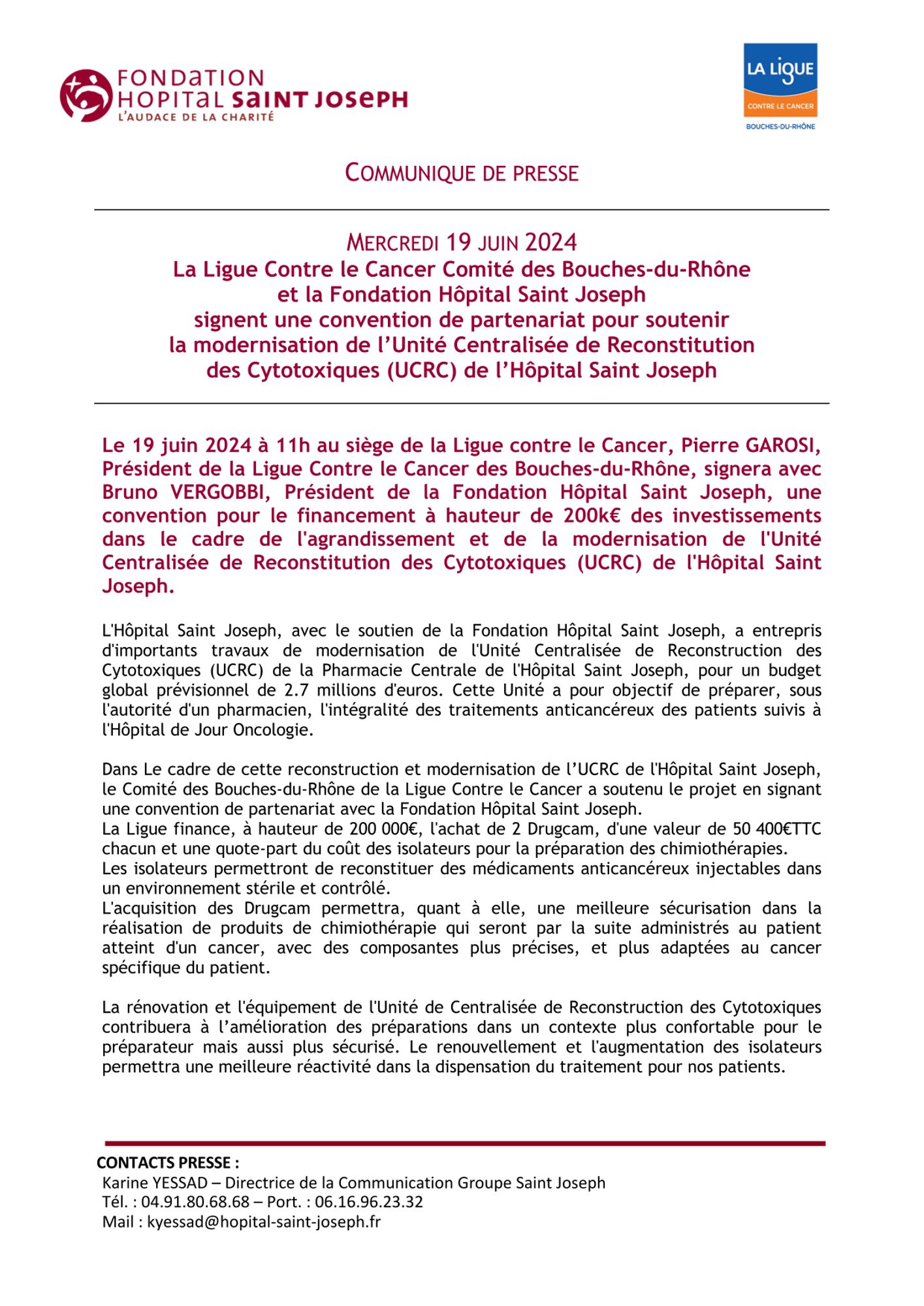 Le 19 juin 2024 à 11h au siège de la Ligue contre le Cancer, Pierre GAROSI, Président de la Ligue Contre le Cancer des Bouches-du-Rhône, signera avec Bruno VERGOBBI, Président de la Fondation Hôpital Saint Joseph, une convention pour le financement à hauteur de 200k€ des investissements dans le cadre de l'agrandissement et de la modernisation de l'Unité Centralisée de Reconstitution des Cytotoxiques (UCRC) de l'Hôpital Saint Joseph.