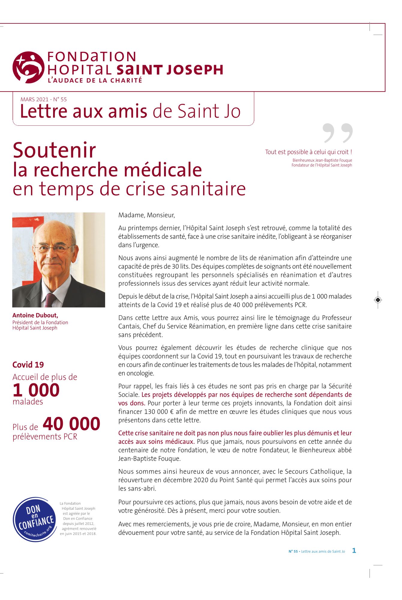 Depuis le début de la crise, l'Hôpital Saint Joseph a accueilli plus de 1 000 malades atteints de la Covid 19 et réalisé plus de 40 000 prélèvements PCR. Dans cette Lettre aux Amis, vous pourrez ainsi lire le témoignage du Professeur Cantais, Chef du Service Réanimation, en première ligne dans cette crise sanitaire sans précédent.