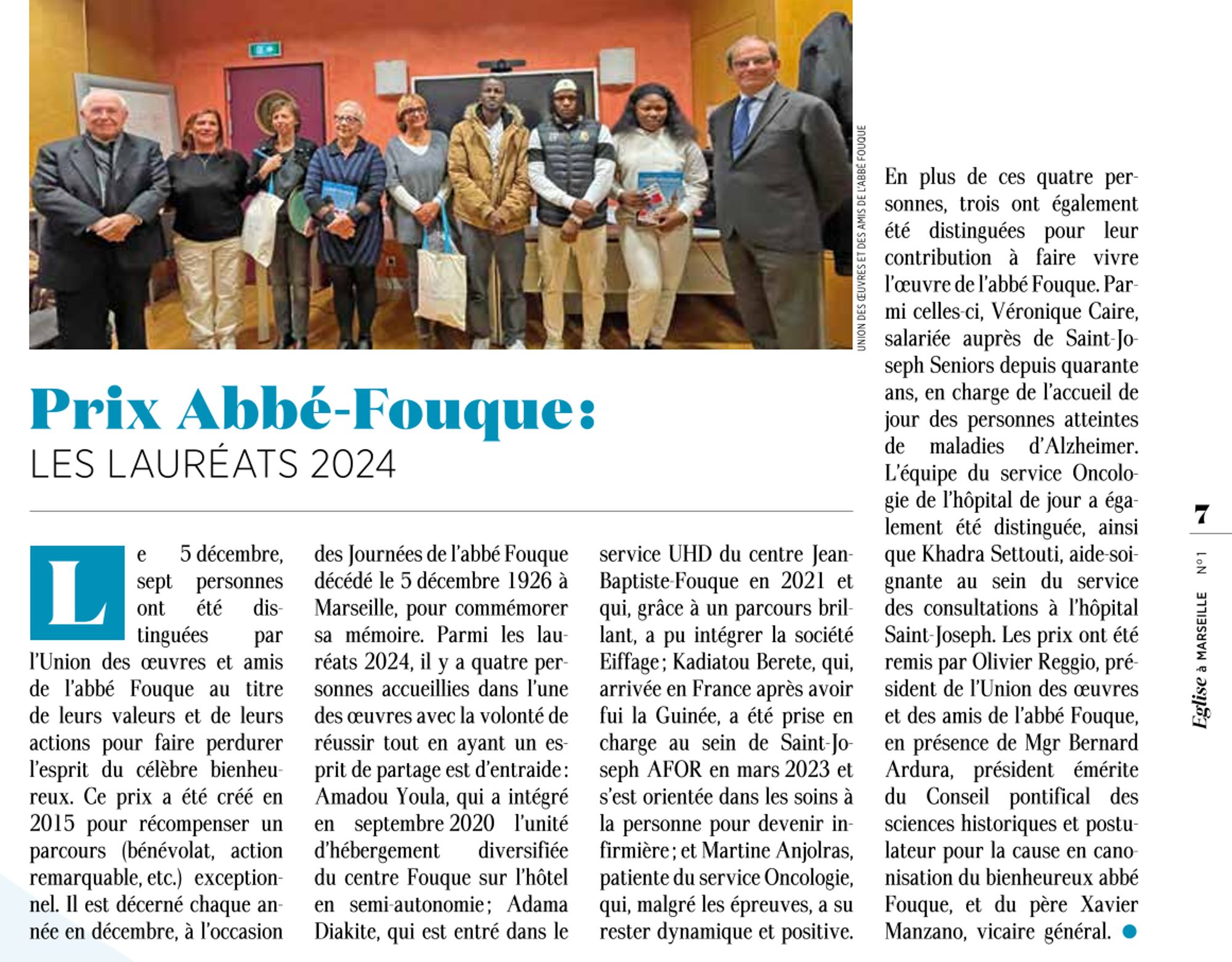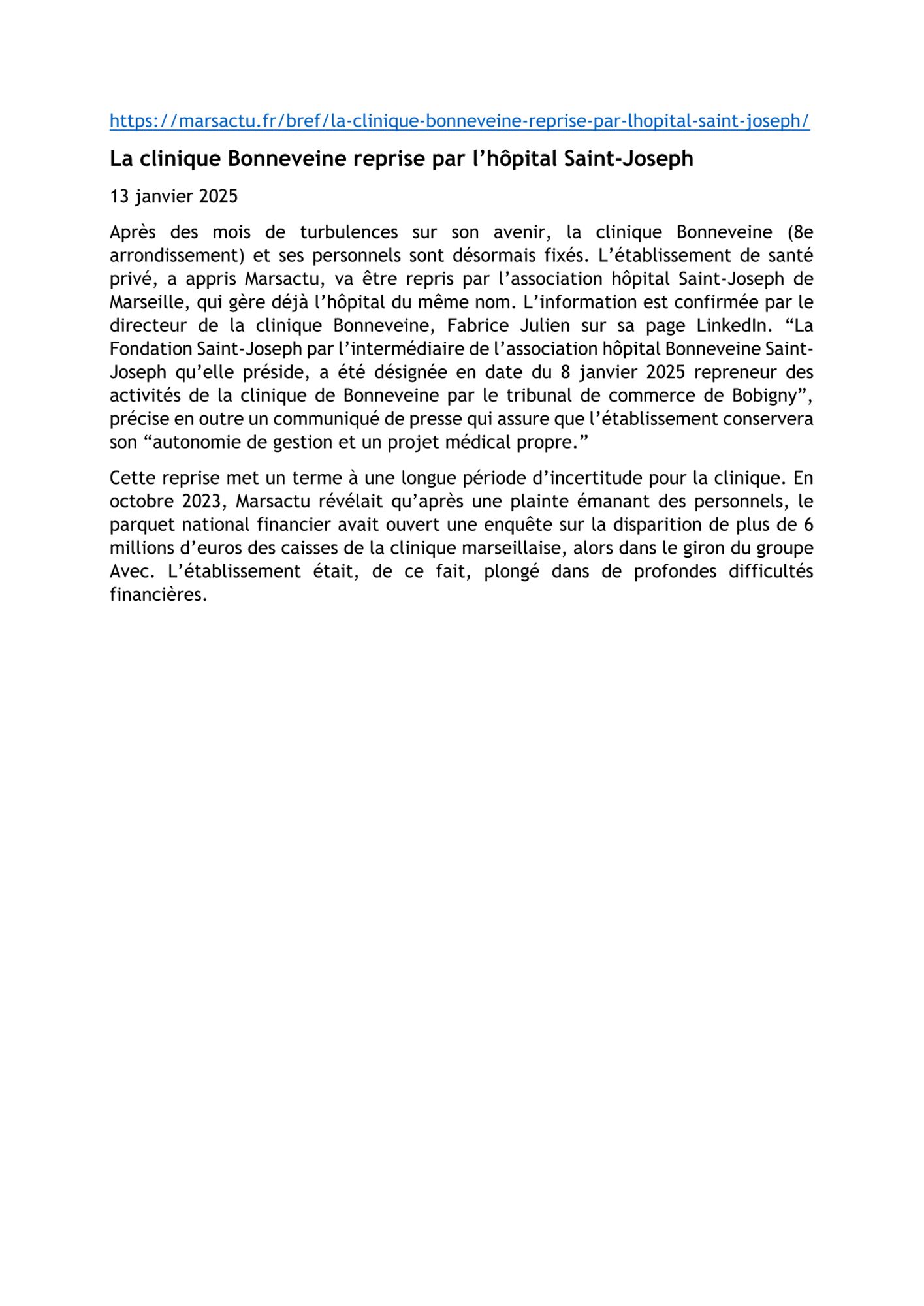 La Revue de Presse 2025 Eglise à Marseille - Janvier 2025 : Prix Abbé-Fouque - Les Lauréats 2024 (156.7 Ko) Hospimedia - 10/01/2025 : Economie - La Clinique Bonneveine à Marseille est reprise par la fondation Hôpital Saint-Joseph (178.2 Ko) Marsactu.fr - 13/01/2025 : La Clinique Bonneveine reprise l'hôpital Saint-Joseph (87.9 Ko)