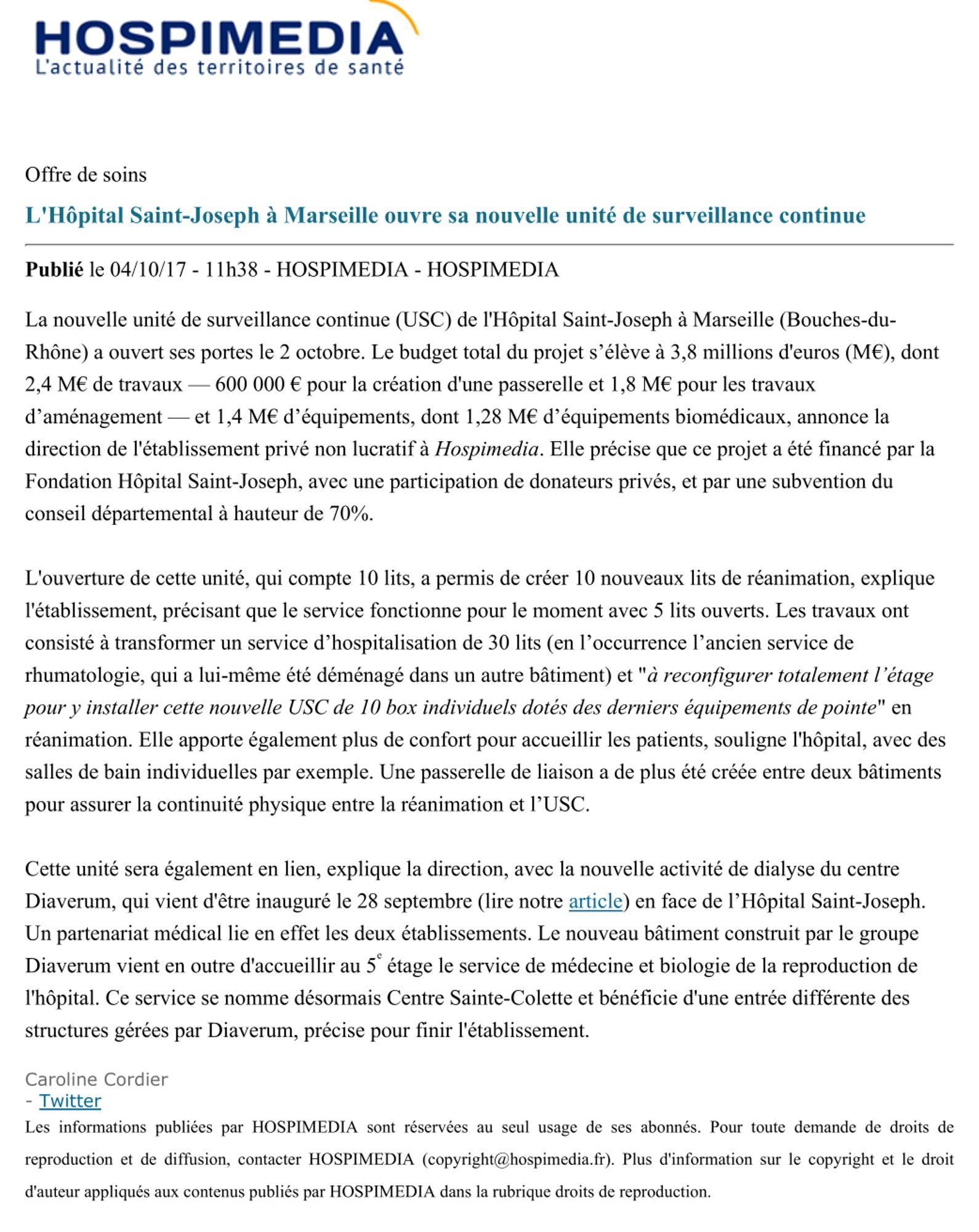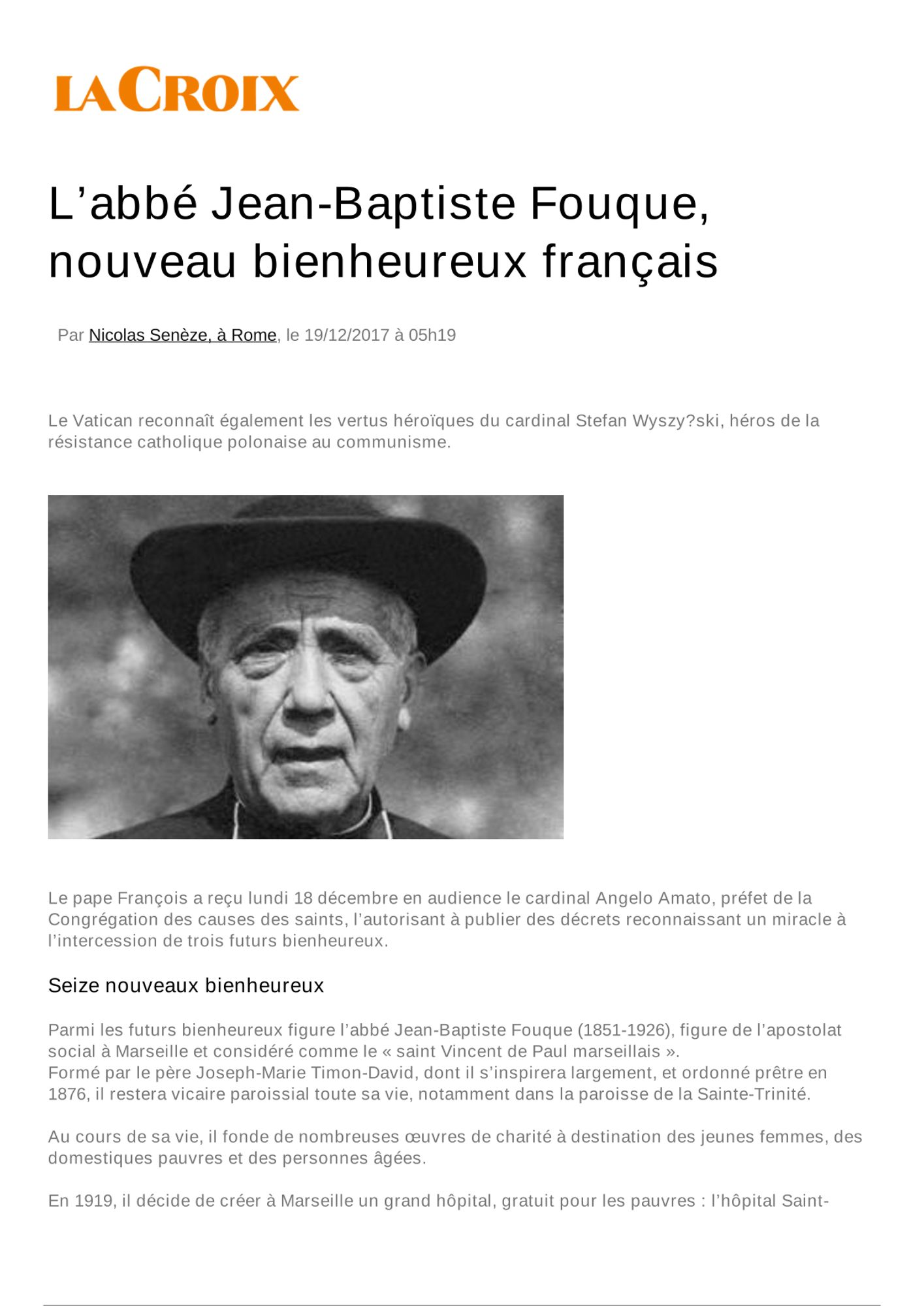 La Revue de Presse 2017 Article du journal La Croix, juin 2017 (62.2 Ko) JurisAssociation n°565, octobre 2017 : Contrôle interne et générosité publique : la nécessité acculturation (400.3 Ko) Hospimédia, 4 octobre 2017 : L'Hôpital Saint Joseph de Marseille ouvre sa nouvelle unité de surveillance continue (133.0 Ko) La Provence, 14 décembre 2017 : Des volontaires aux petits soins (890.1 Ko) Revue de presse sur la Béatification de l'abbé Fouque (3.7 Mo)