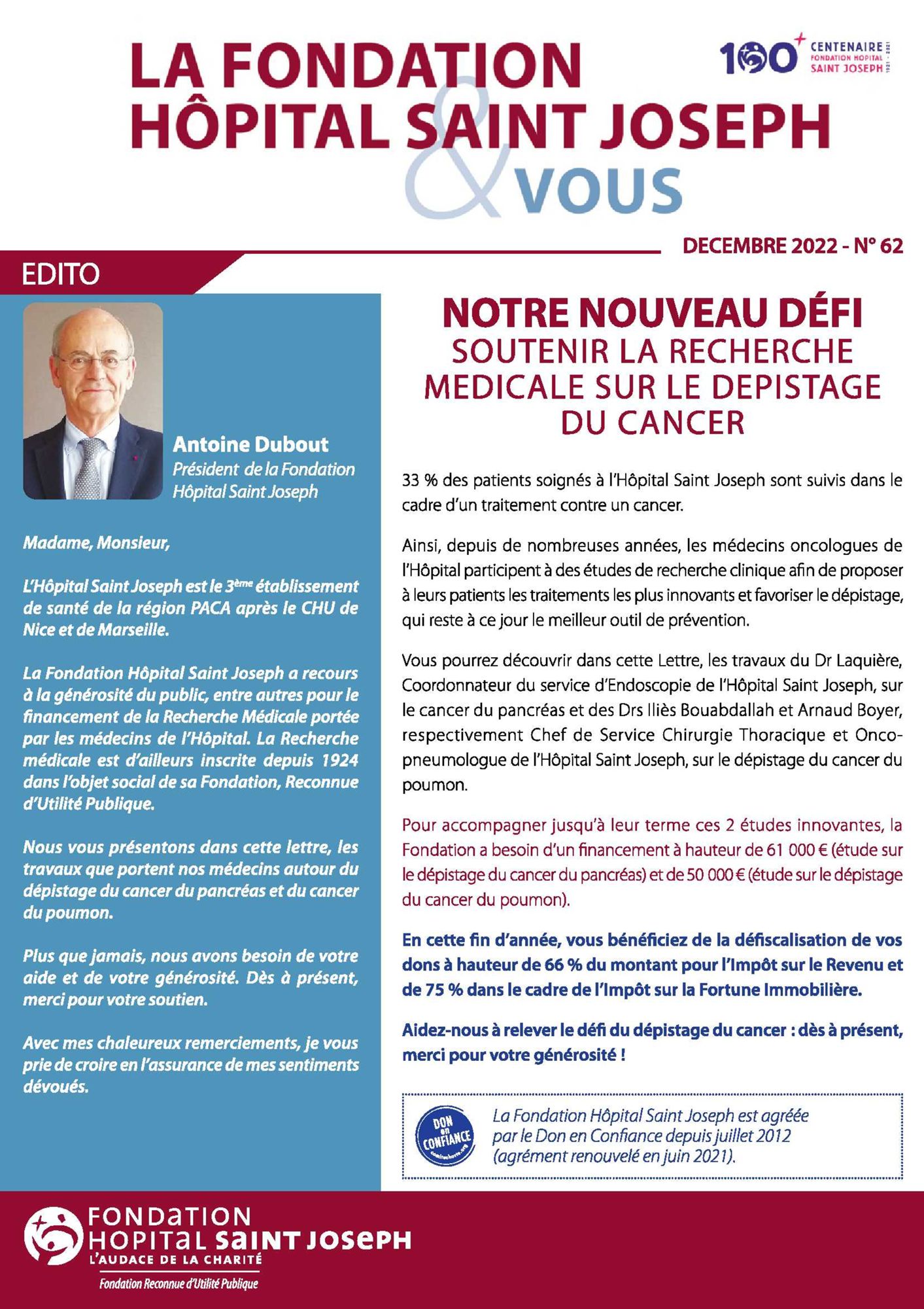 Lettre aux Amis n°62 : Notre nouveau défi, soutenir la recherche médicale sur le dépistage du cancer