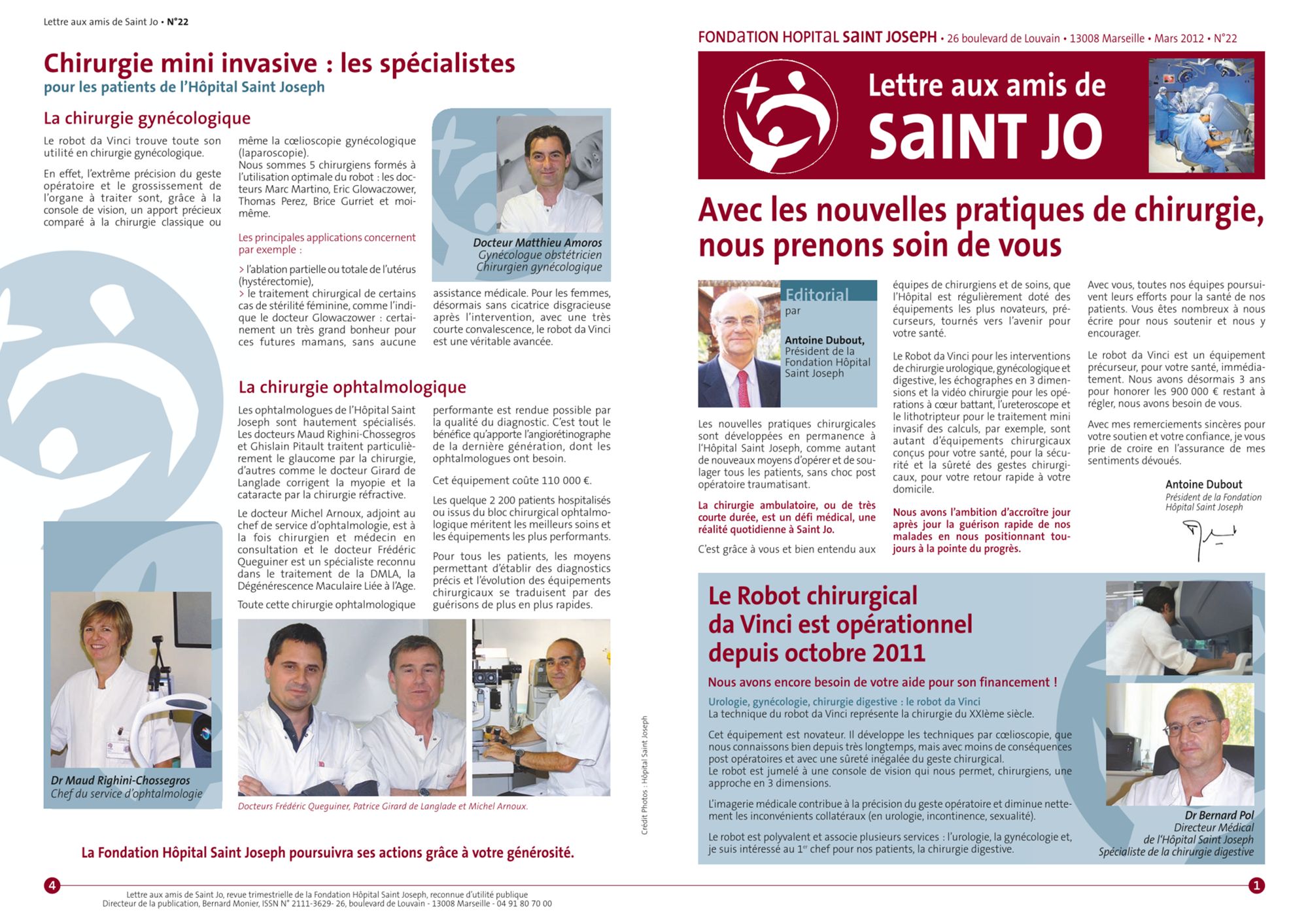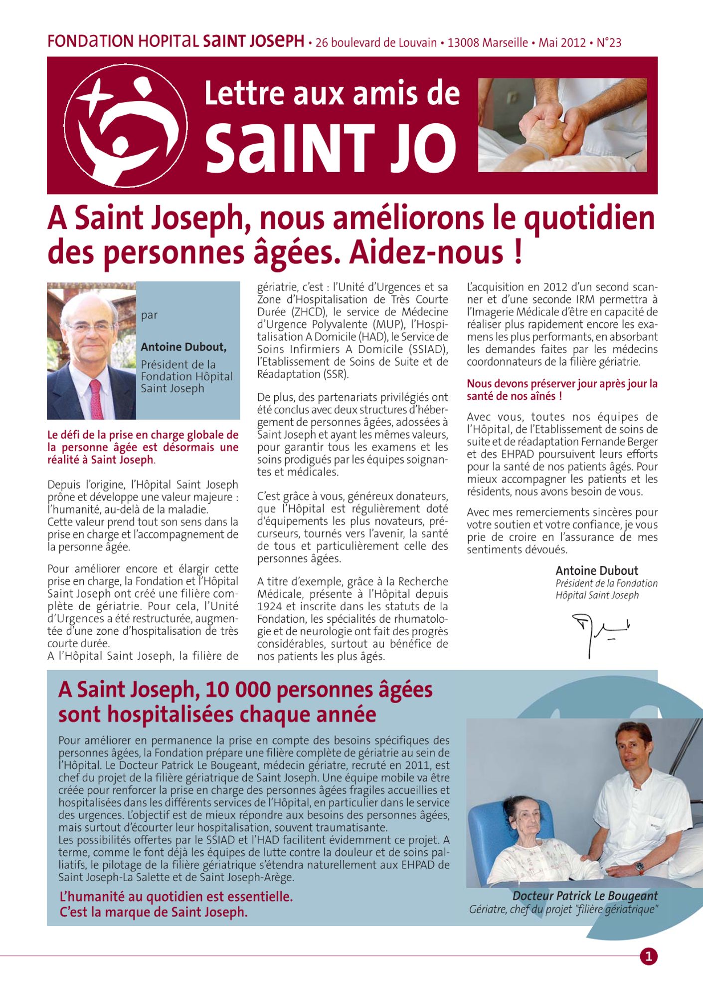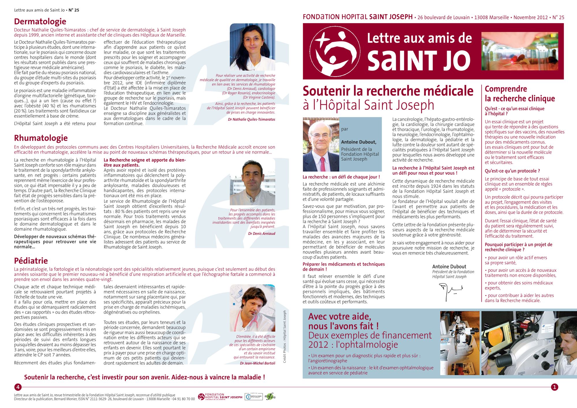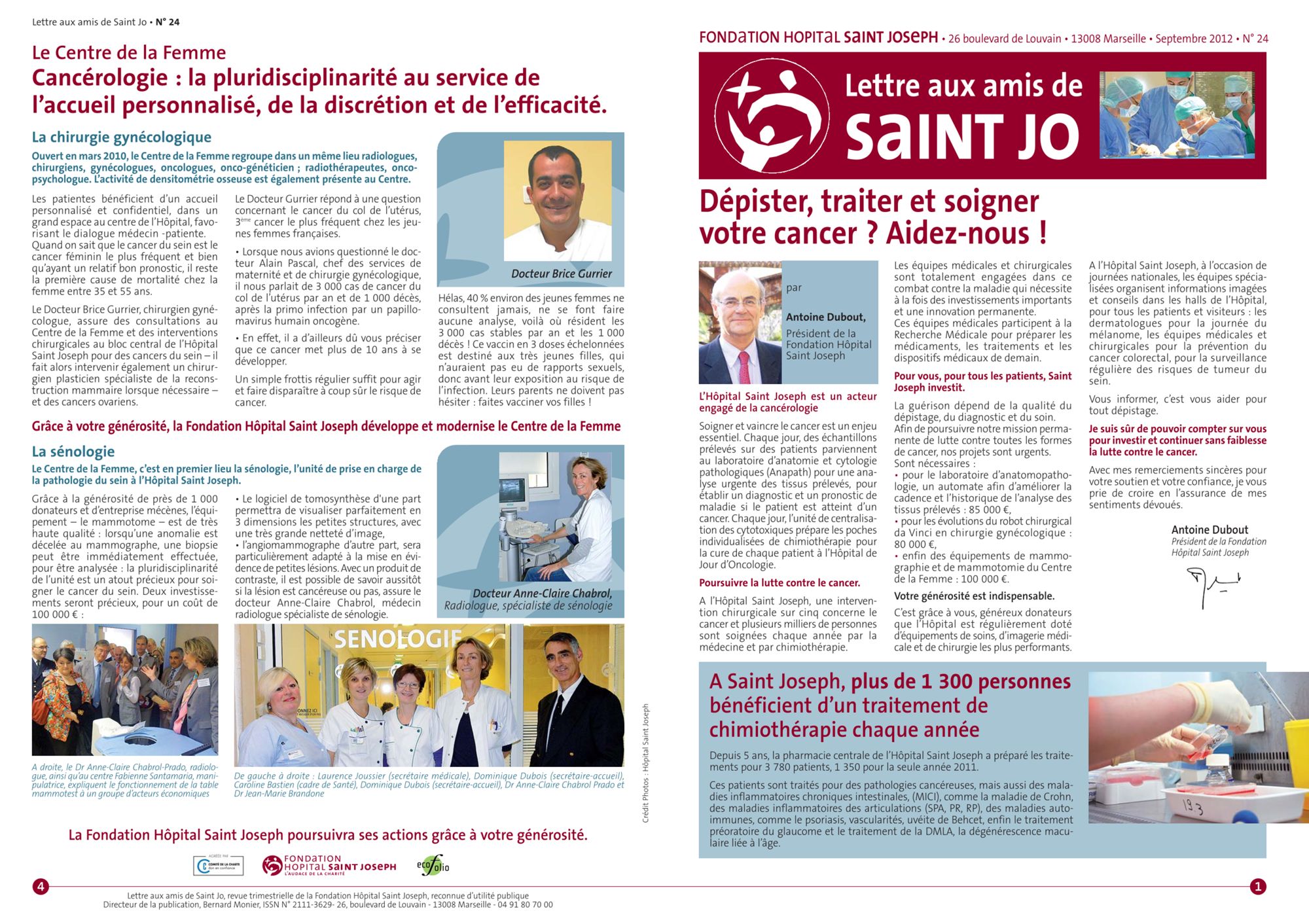 2012 Lettre aux amis n°25 : Soutenir la Recherche Médicale à l'Hôpital Saint Joseph (660.5 Ko) Lettre aux amis n°24 : Dépister, traiter et soigner votre cancer? Aidez nous! (918.0 Ko) Lettre aux amis n°23 : A Saint Joseph, nous améliorons le quotidien des personnes âgées. Aidez nous! (846.8 Ko) Lettre aux amis n°22 : Avec les nouvelles pratiques de chirurgie, nous prenons soins de vous (722.1 Ko)