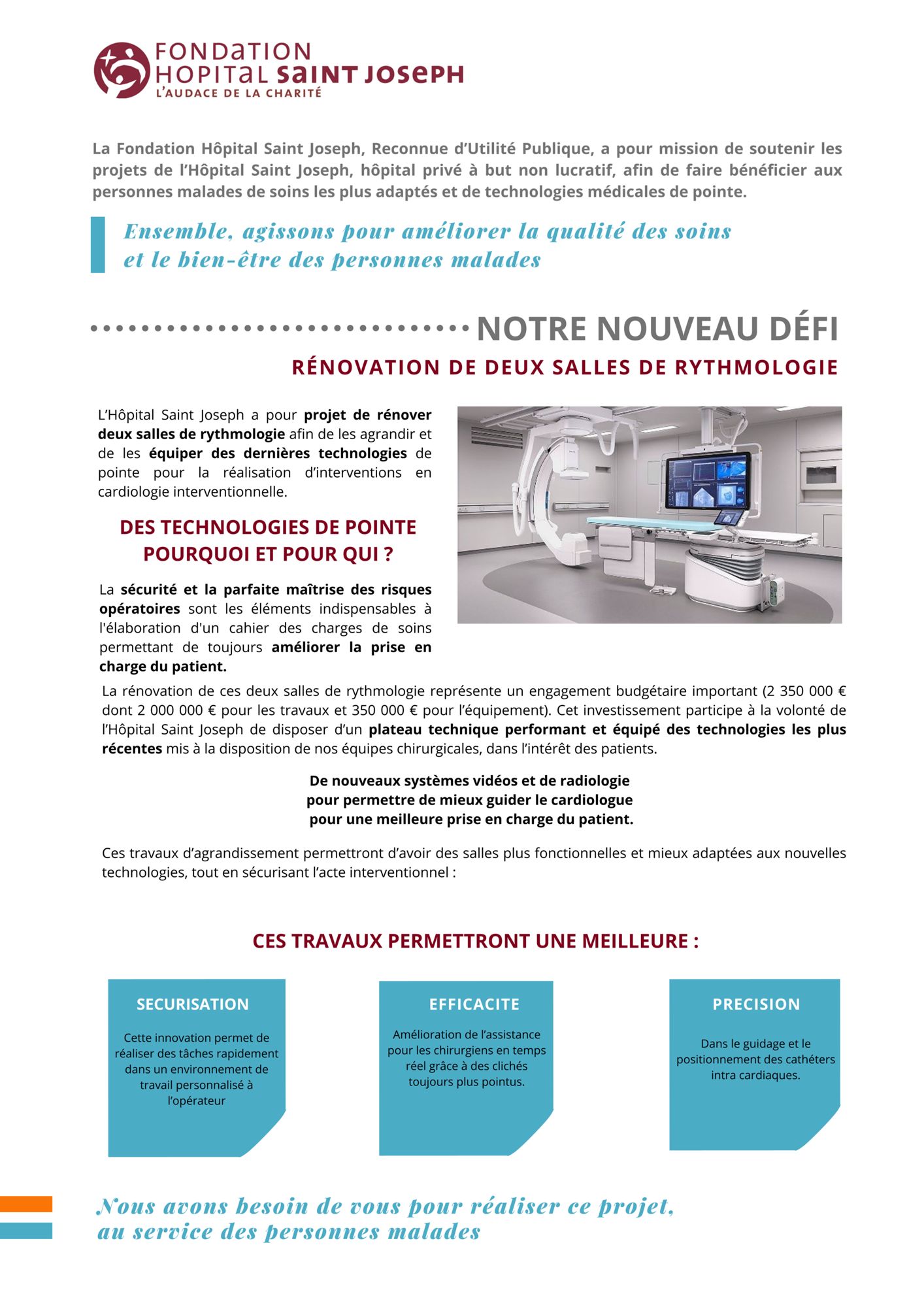 L’Hôpital Saint Joseph a pour projet de rénover deux salles de rythmologie afin de les agrandir et de les équiper des dernières technologies de pointe pour la réalisation d’interventions en cardiologie interventionnelle.