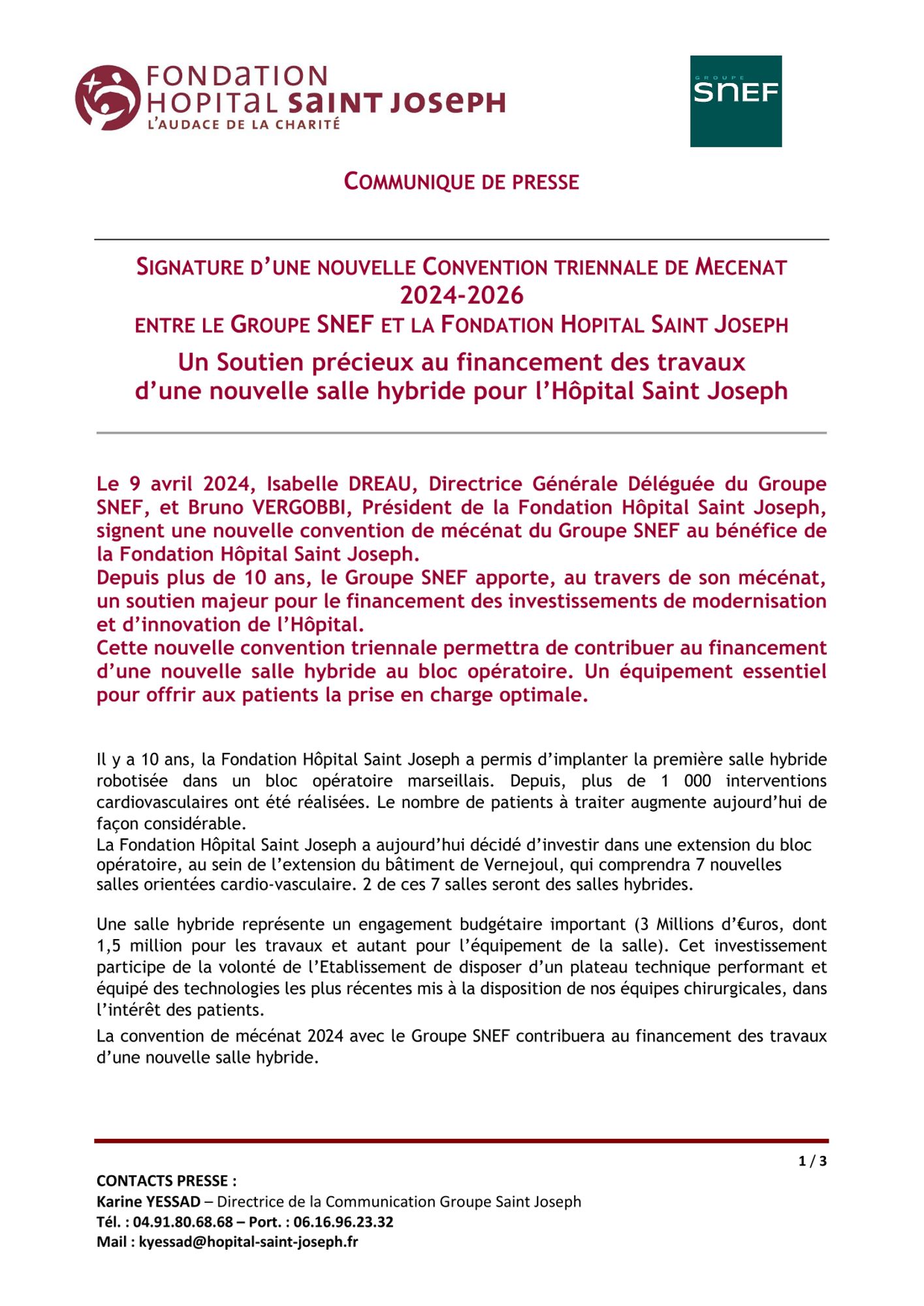 Plus récemment, le Groupe SNEF a participé au financement de la deuxième salle hybride de l'Hôpital Saint Joseph.