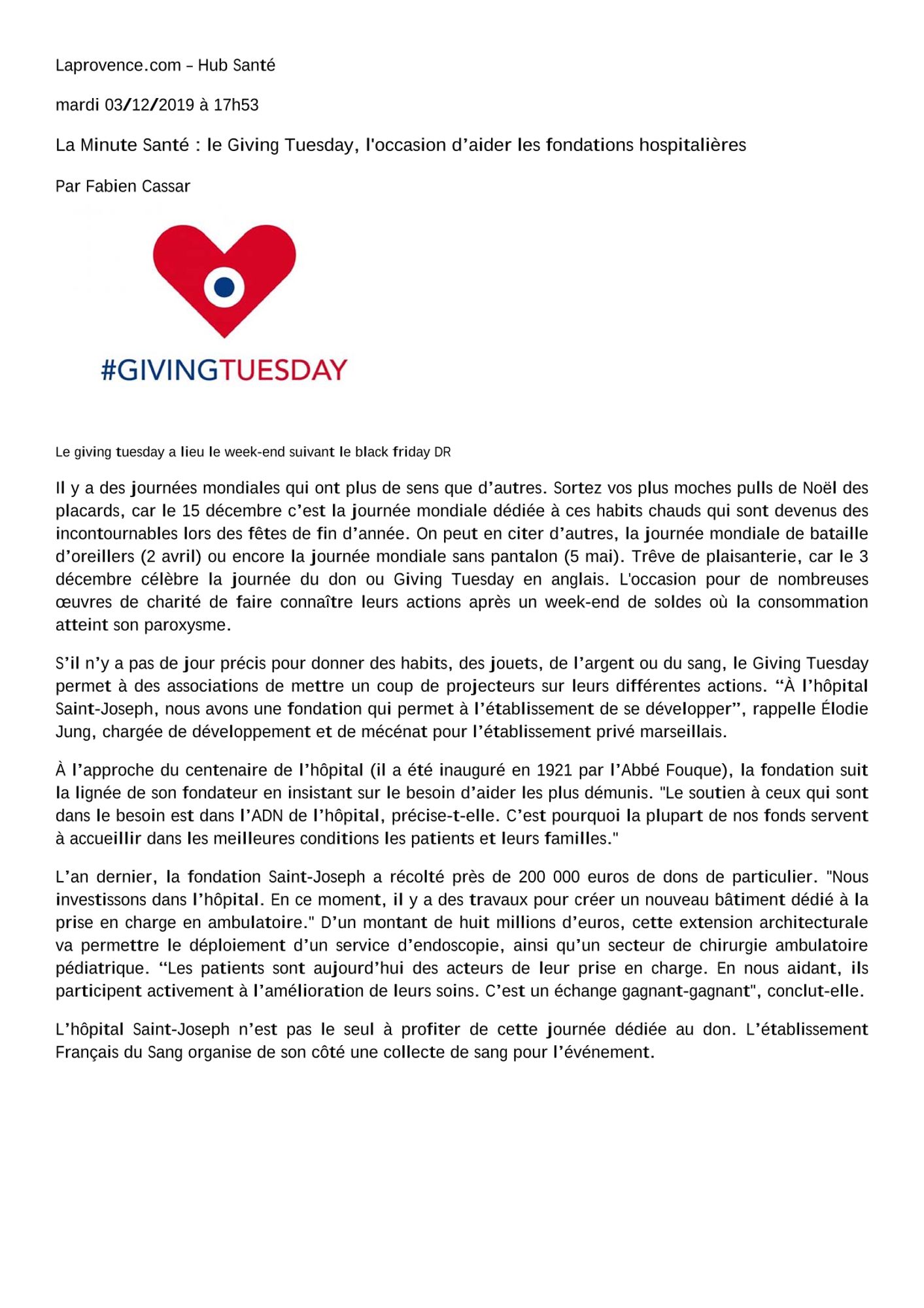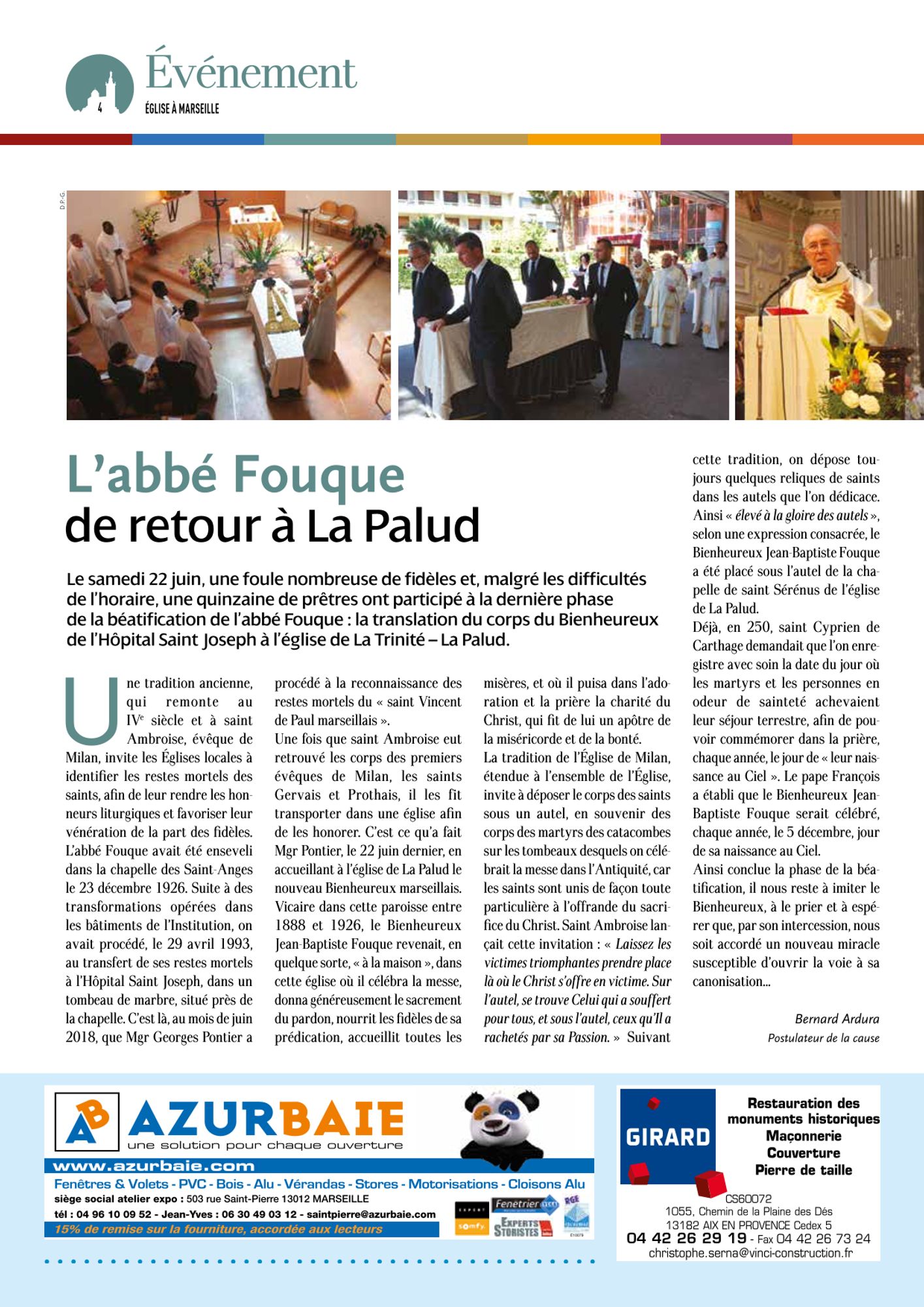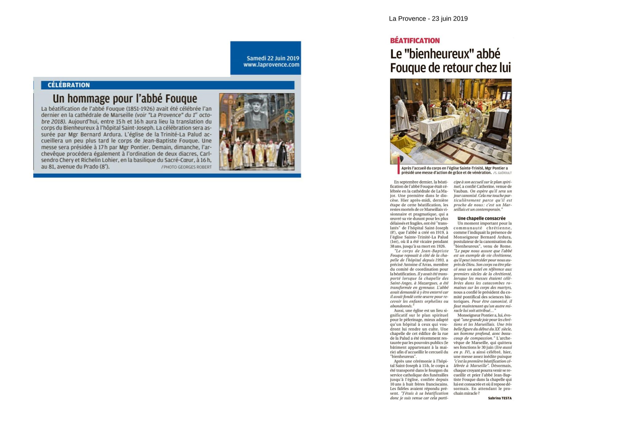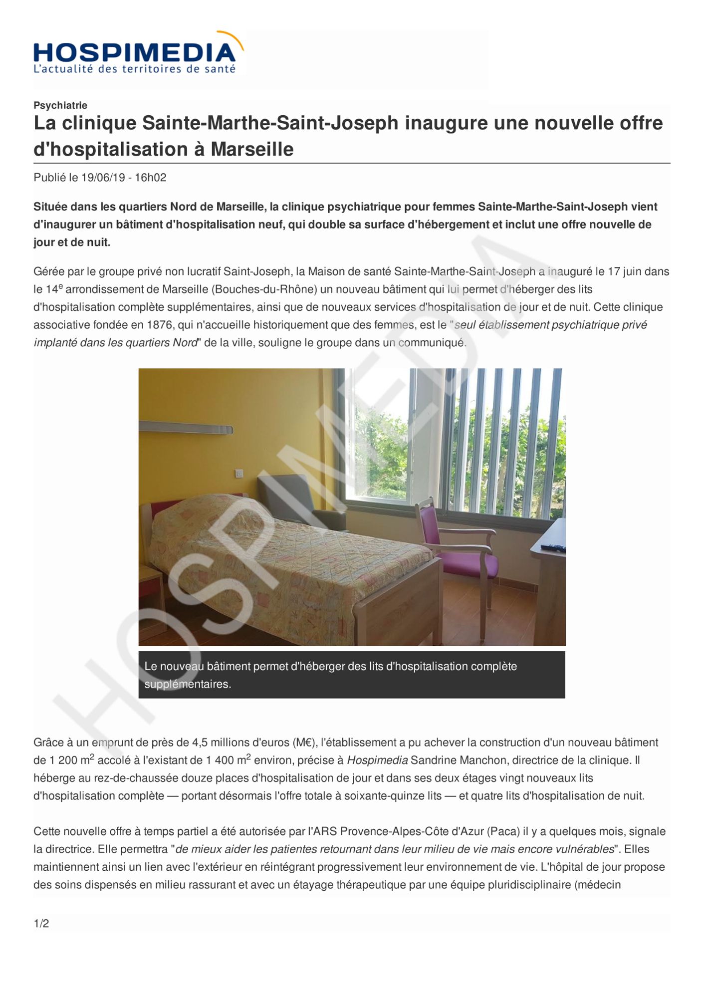 La revue de Presse 2019 Perspective Sanitaire & Sociale : Hommage à Antoine Dubout (2.6 Mo) Hospimédia, 19/06/2019 : La clinique Sainte-Marthe-Saint-Joseph inaugure une nouvelle offre d'hospitalisation à Marseille (423.9 Ko) La Provence, 22 & 23 juin : La translation de l'abbé Fouque (345.9 Ko) Hospimedia, 05/07/2019 : Hôpital Saint Joseph et Hôpital Européen de Marseille se fédèrent via l'association Audeam (116.8 Ko) La Provence, 06/07/2019 : Santé : le grand chamboulement - Les hôpitaux Saint Joseph et Européen ont annoncé leur rapprochement sous forme d'association (1.9 Mo) Eglise à Marseille, Juillet-Août 2019 : L'abbé Fouque de retour à La Palud (331.7 Ko) www.unidivers.fr, 16/08/2019 : L'église de la Trinité : quartier général providentiel du Bienheureux Abbé Fouque (256.3 Ko) La Provence Hub Santé, 03/12/2019 : Le Giving Tuesday, l'occasion d'aider les fondations hospitalières (20.5 Ko)