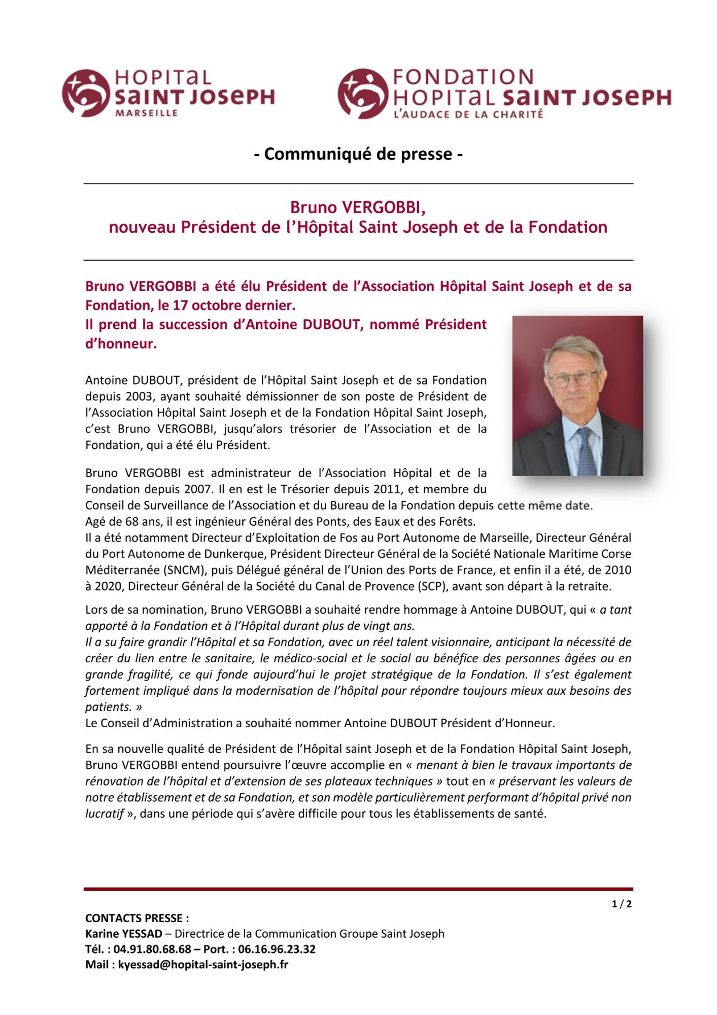 Antoine DUBOUT, président de l’Hôpital Saint Joseph et de sa Fondation depuis 2003, ayant souhaité démissionner de son poste de Président de l’Association Hôpital Saint Joseph et de la Fondation Hôpital Saint Joseph, c’est Bruno VERGOBBI, jusqu’alors trésorier de l’Association et de la Fondation, qui a été élu Président.