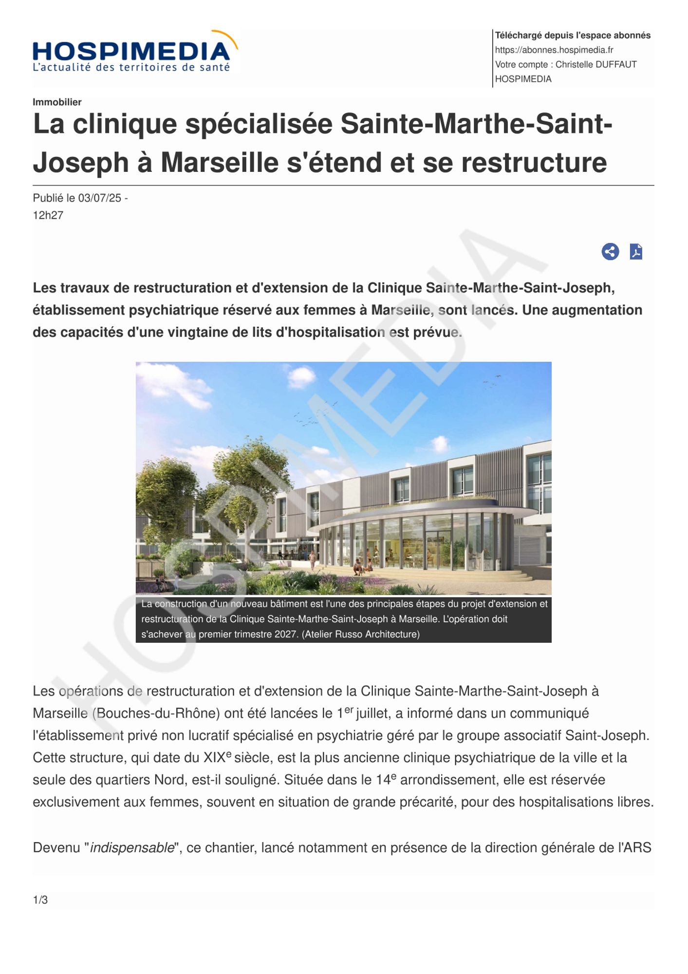 En juillet 2025, la Clinique Sainte Marthe-Saint Joseph a officiellement lancé les travaux de restructuration et extension de l'établissement, en présence de Yann Bubien Directeur Général de l' ARS PACA, Marion Bareille, Maire des 13eme et 14ème arrondissements de Marseille, Conseillère municipale de Marseille, Conseillère de la métropole Aix Marseille Provence, et Marie-Hélène Amssalem, adjointe à la mairie représentante de Monsieur le Maire Benoit PAYEN, qui ont tous souligné combien l’établissement, implantée dans les quartiers nord, était précieux.
